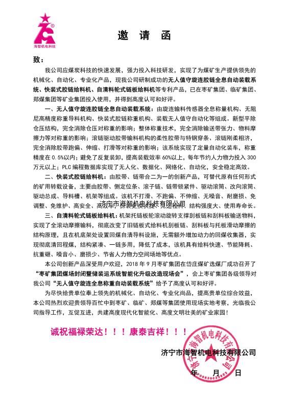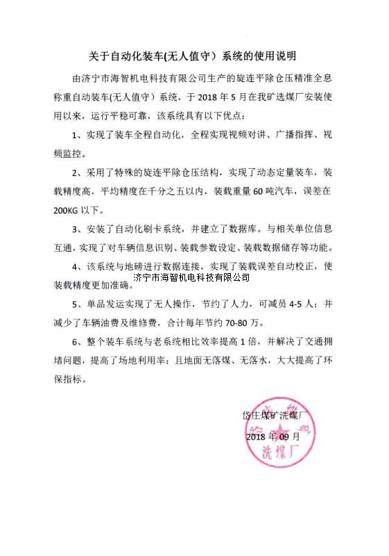 本產(chǎn)品一經(jīng)推出即獲得各大設(shè)計(jì)院及用戶的一致好評(píng),率先在棗礦集團(tuán)岱莊煤礦取得成功應(yīng)用,2018年9月受邀參加了《棗礦集團(tuán)煤場(chǎng)封閉暨儲(chǔ)裝運(yùn)系統(tǒng)智能化升級(jí)改造現(xiàn)場(chǎng)會(huì)》,智能裝車系統(tǒng)得到了充分肯定!我司憑借雄厚的加工制造實(shí)力及過硬的創(chuàng)新技術(shù)能力,勢(shì)必為運(yùn)輸稱重系統(tǒng)、快速計(jì)量裝車系統(tǒng)帶來又一次的技術(shù)創(chuàng)新變革。